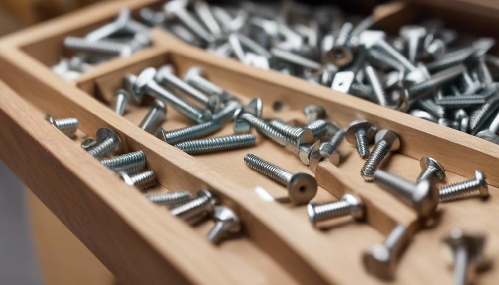 When selecting screws for drawer slides, you'll want to consider długość śruby, średnicę i materiał. Śruby powinny wkręcać się w szufladę i szafkę bez ryzyka uszkodzenia. Krótkie śruby mogą nie trzymać się mocno, podczas gdy długie mogą rozdzierać drewno. Wybierz stal nierdzewną dla trwałości, lub stal węglową dla oszczędności. Upewnij się, że gwinty śrub są zgodne z materiałami twoich prowadnic; grube gwinty najlepiej sprawdzają się w miękkich drewnach. Również, upewnij się, że wszystko jest wypoziomowane podczas instalacji, aby zapewnić płynne działanie szuflady. Jest więcej do odkrycia na temat maksymalizacji ustawienia prowadnic szuflad i zapewnienia, że wszystko działa bezproblemowo.